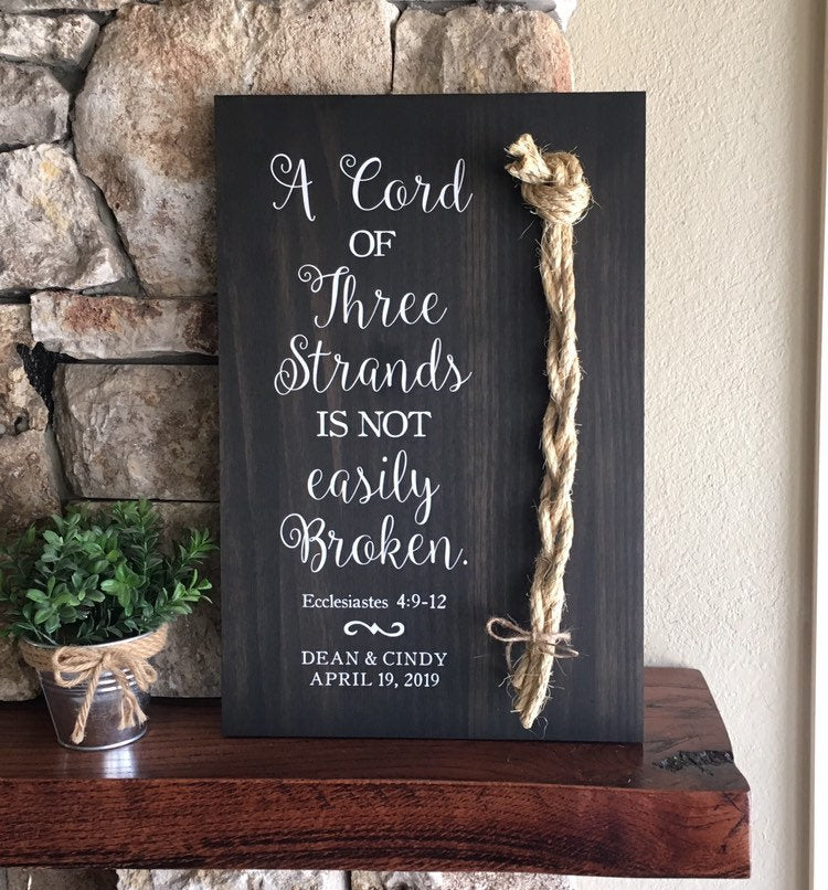 A wonderful wedding gift, anniversary gift, or perfect for display on a table at a wedding or reception! This sign features the verse "A cord of three strands is not easily broken" (Ecclesiastes 4: 12). It also includes a lovely rope detail appearing next to the verse. This sign comes in two sizes and is available in several stains options.