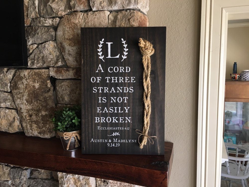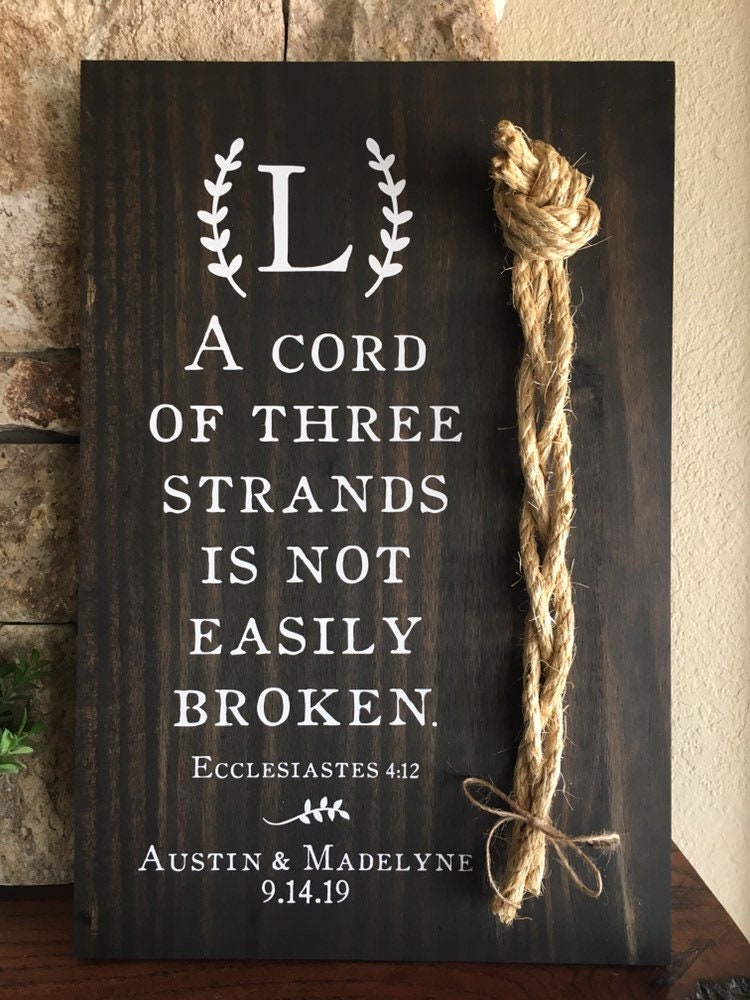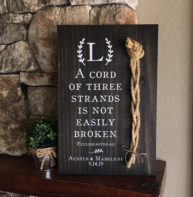 A wonderful wedding gift, anniversary gift, or perfect for display on a table at a wedding or reception! This sign features the verse "A cord of three strands is not easily broken" (Ecclesiastes 4: 12). It also includes a lovely rope detail appearing next to the verse. This sign comes in two sizes and is available in several stains options.