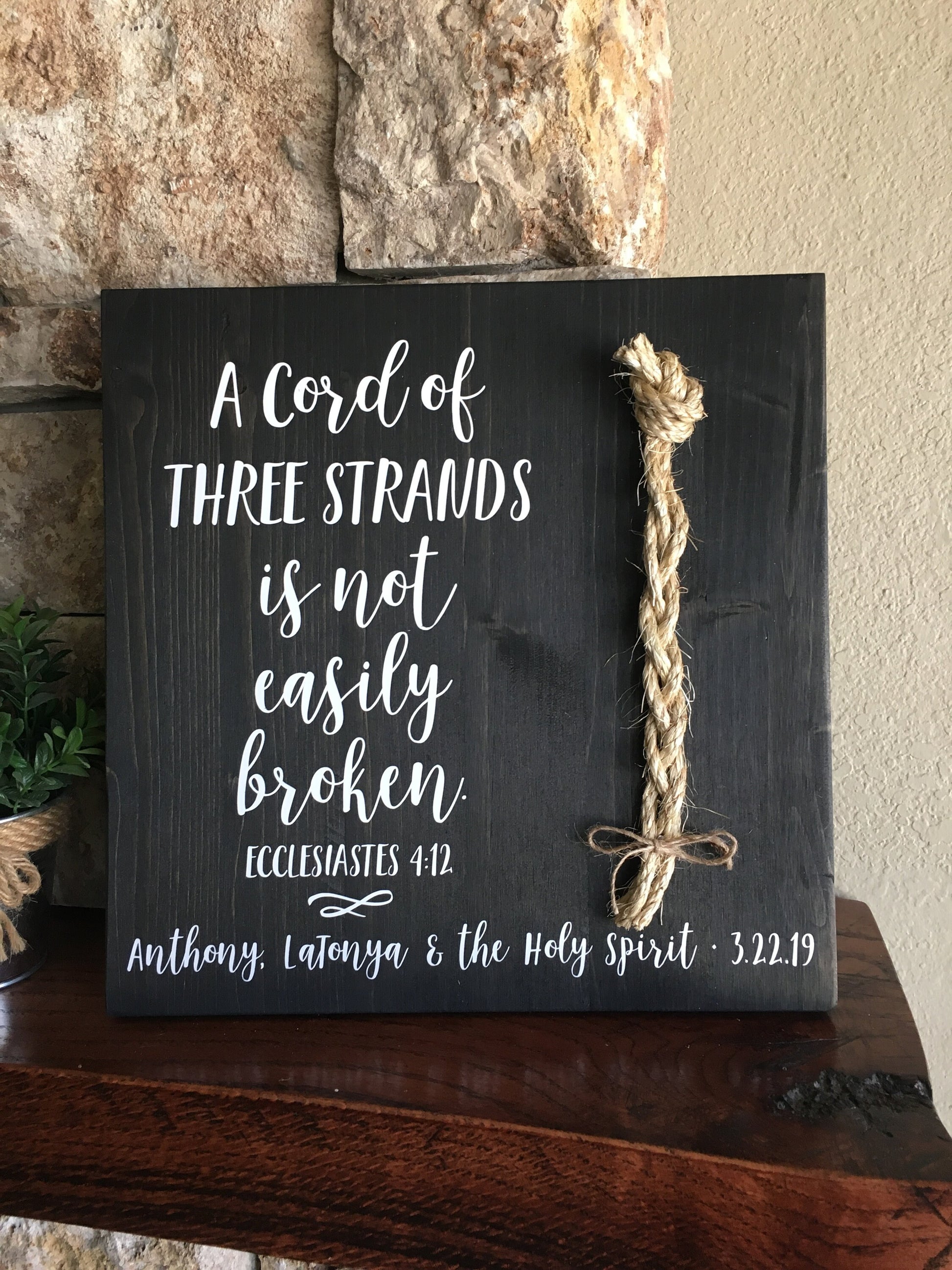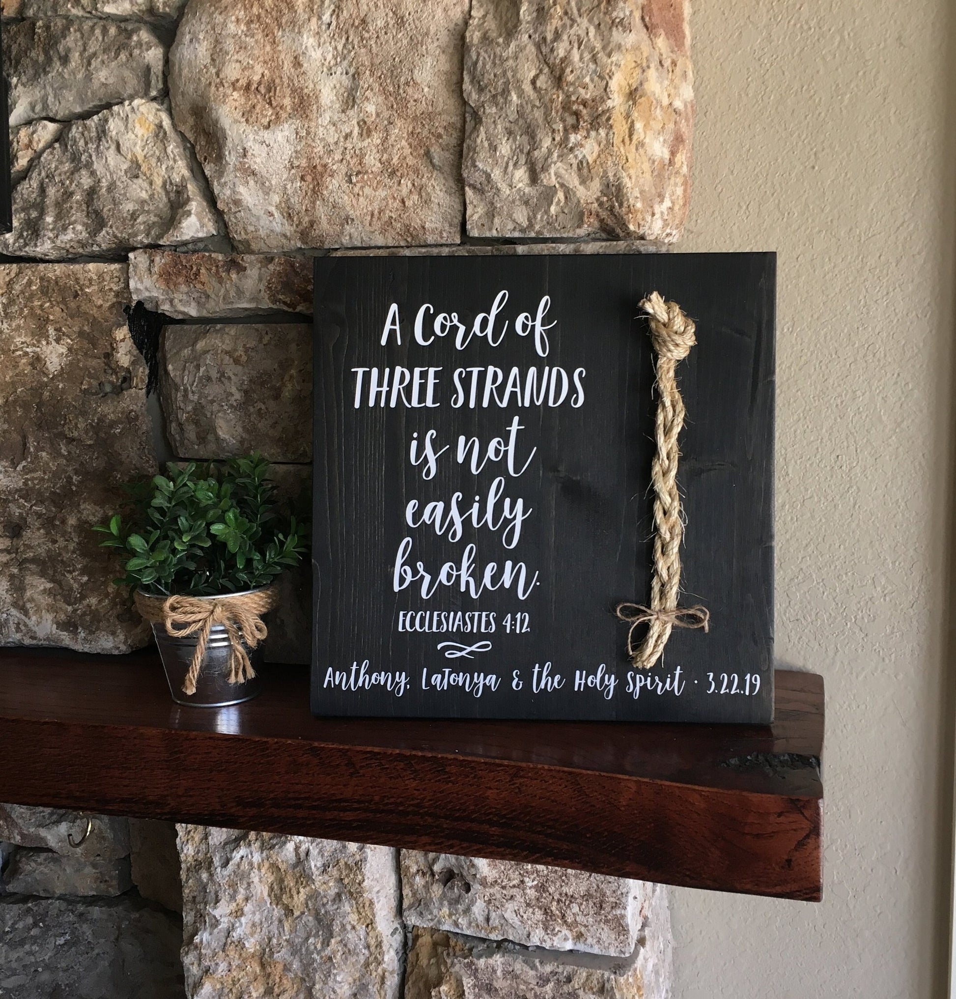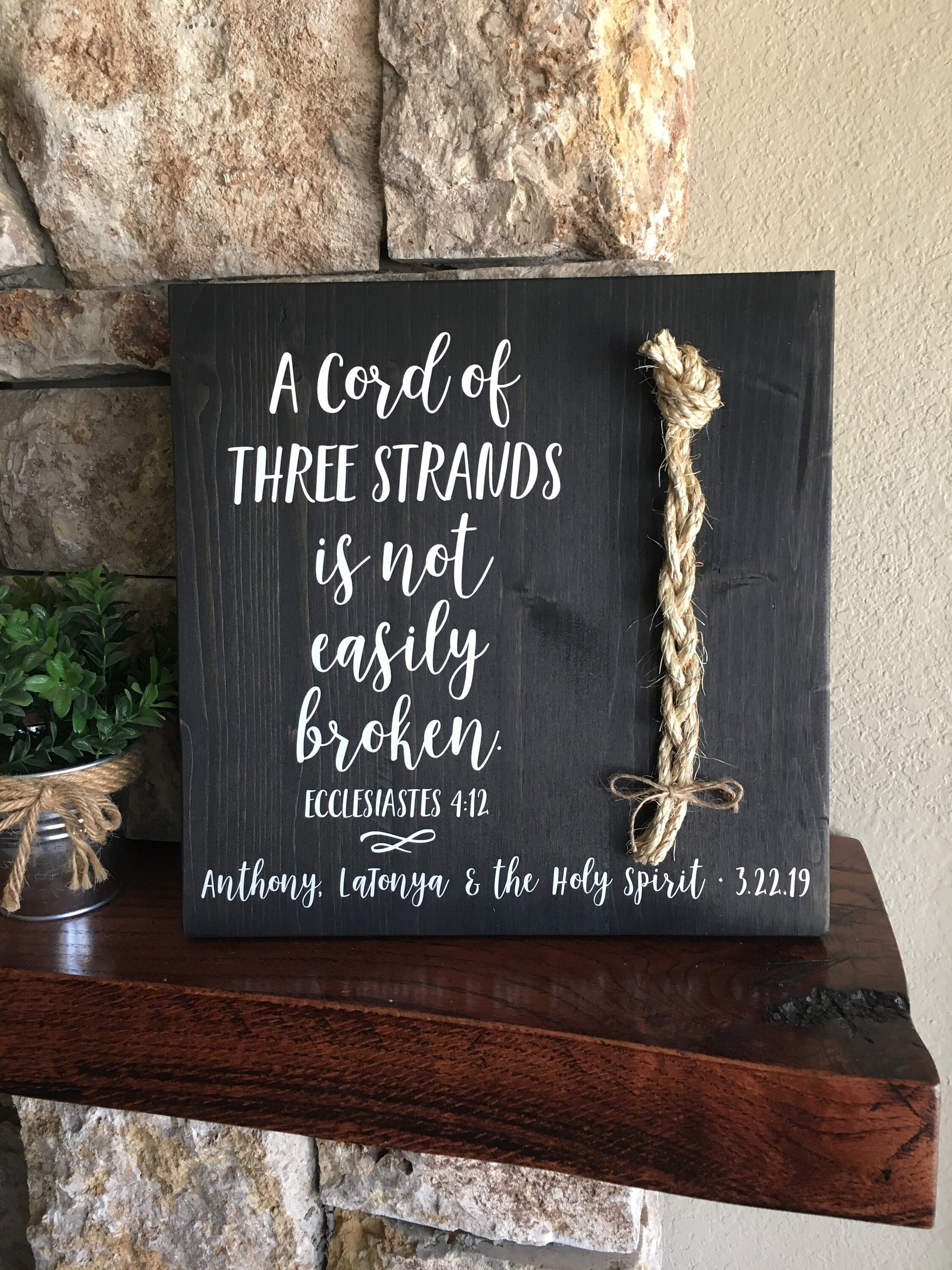 A wonderful wedding gift, anniversary gift, or perfect for display on a table at a wedding or reception! This sign features the verse "A cord of three strands is not easily broken" (Ecclesiastes 4: 12). It also includes a lovely rope detail appearing next to the verse. Please note the rustic white finish will have black lettering.