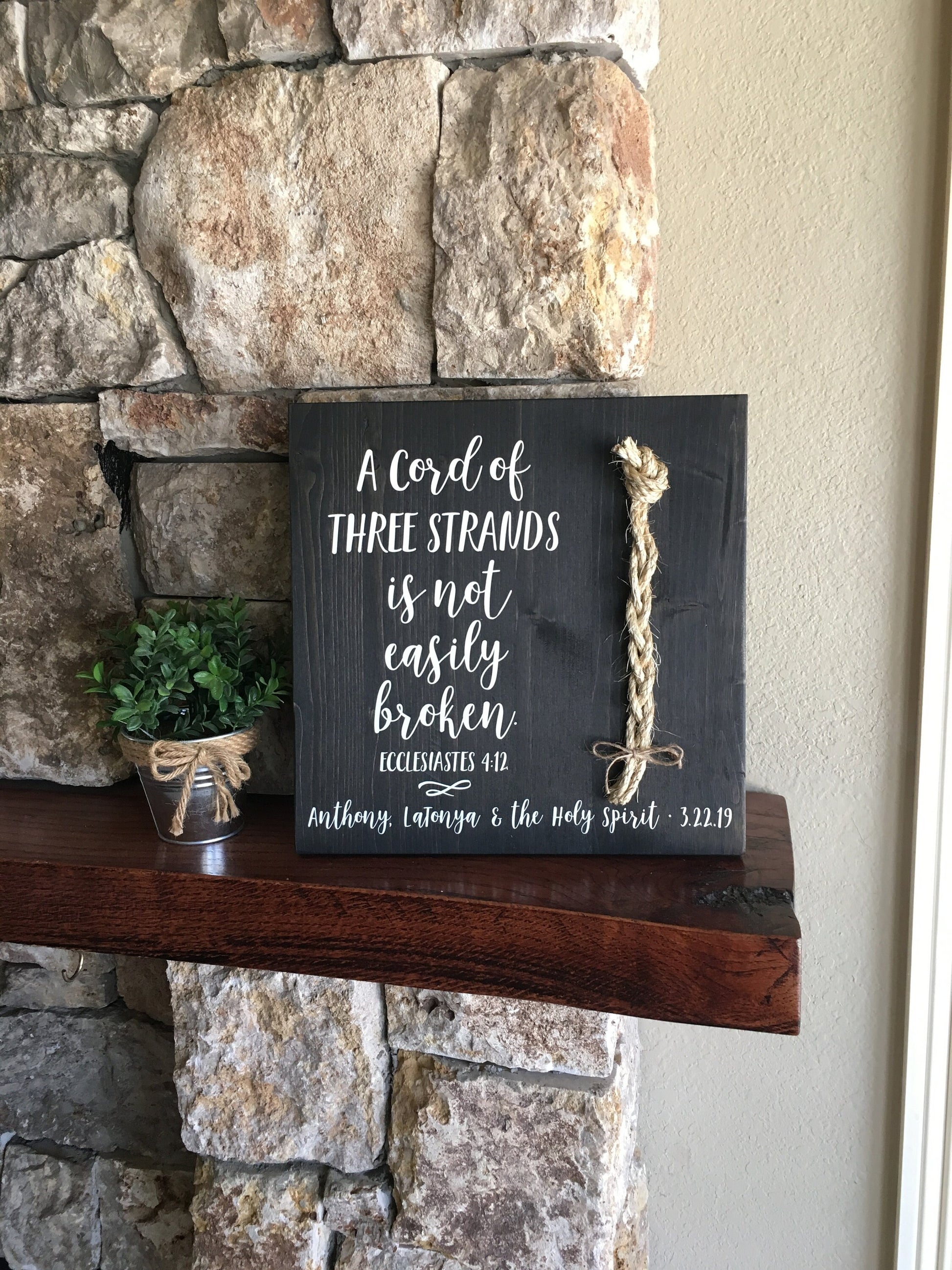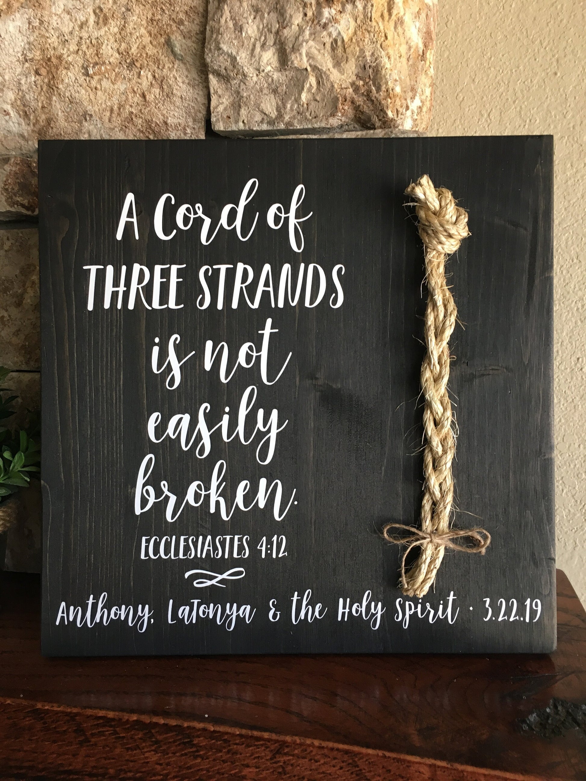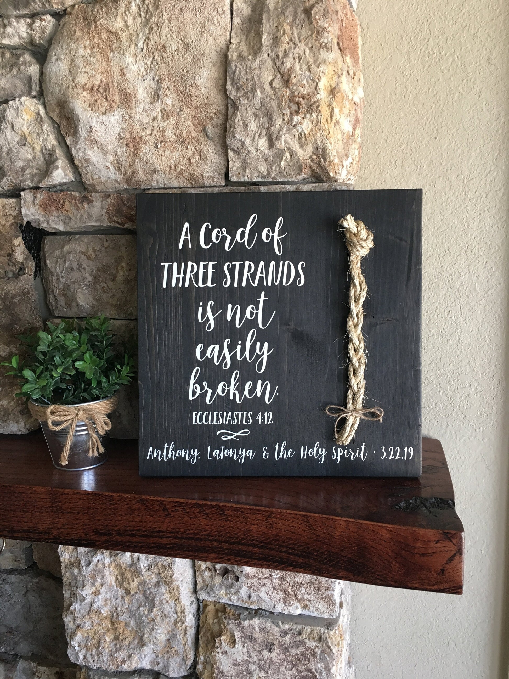 A wonderful wedding gift, anniversary gift, or perfect for display on a table at a wedding or reception! This sign features the verse "A cord of three strands is not easily broken" (Ecclesiastes 4: 12). It also includes a lovely rope detail appearing next to the verse. Please note the rustic white finish will have black lettering.