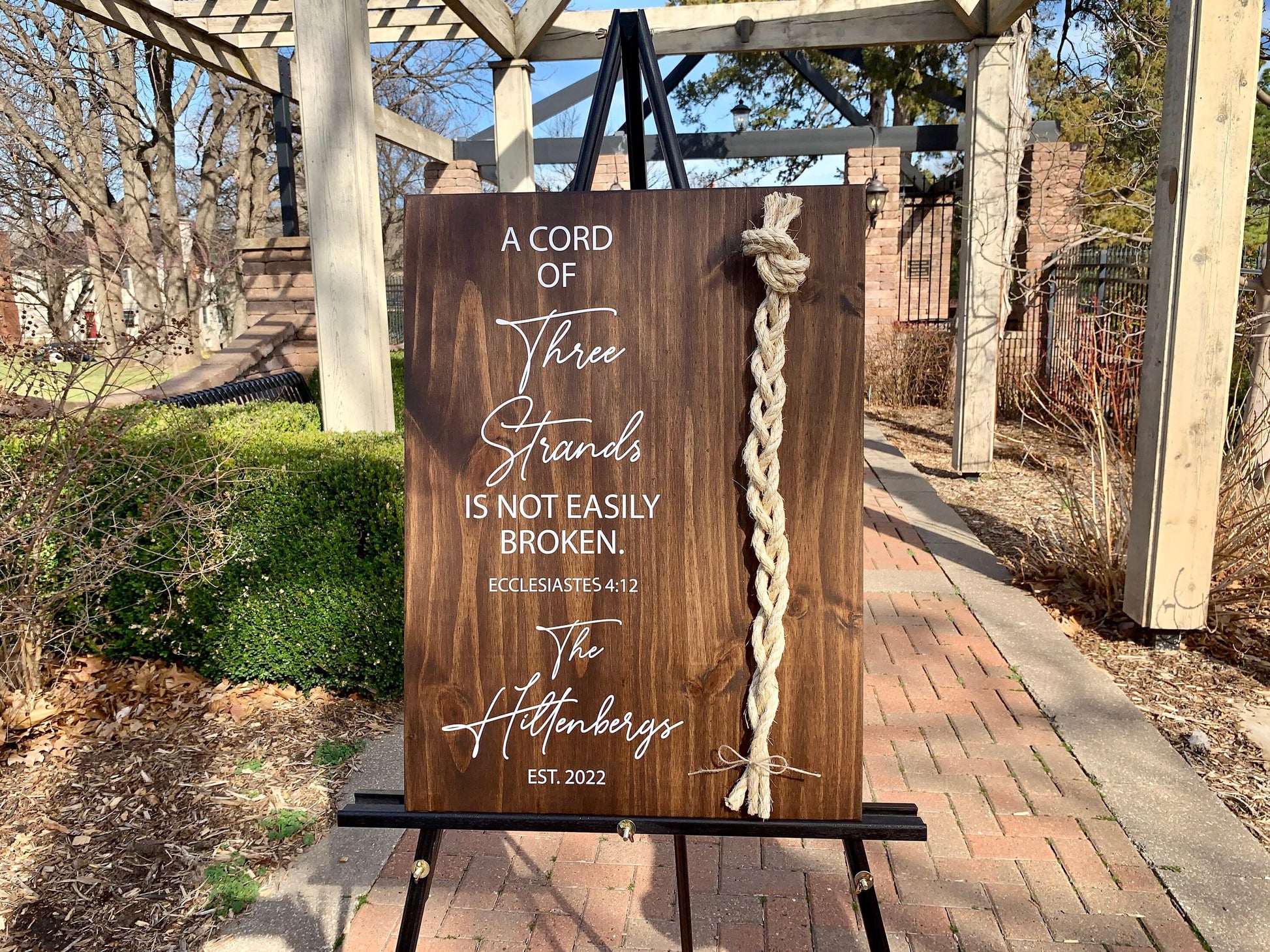 A wonderful wedding gift, anniversary gift, or perfect for display on a table at a wedding or reception! This sign features the verse "A cord of three strands is not easily broken" (Ecclesiastes 4: 12). It also includes a lovely rope detail (white cotton cords) appearing next to the verse. This sign comes in two sizes and is available in several stains options. Design is UV printed. Wall hardware is included.
