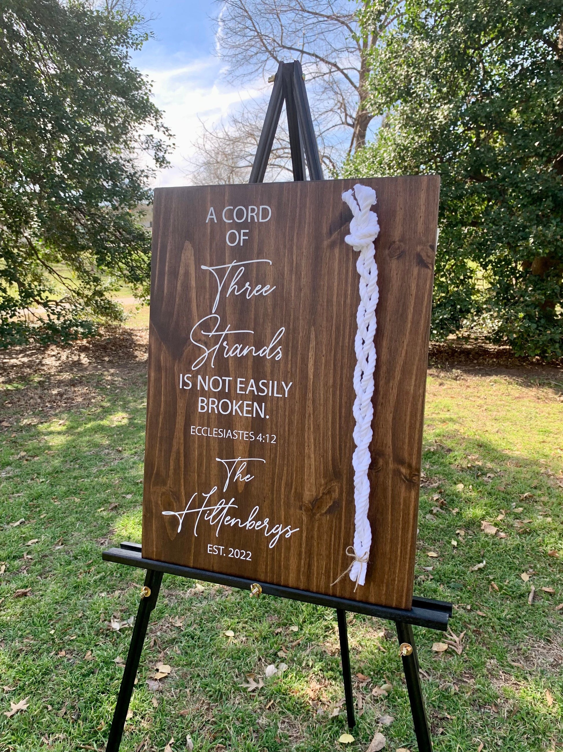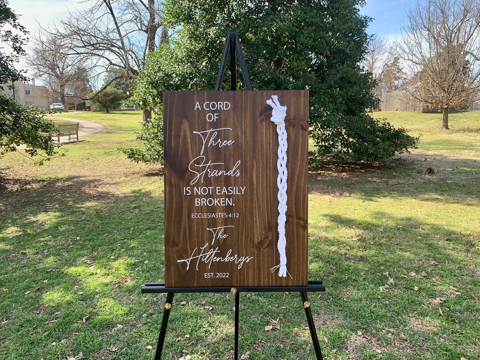 A wonderful wedding gift, anniversary gift, or perfect for display on a table at a wedding or reception! This sign features the verse "A cord of three strands is not easily broken" (Ecclesiastes 4: 12). It also includes a lovely rope detail (white cotton cords) appearing next to the verse. This sign comes in two sizes and is available in several stains options. Design is UV printed. Wall hardware is included.