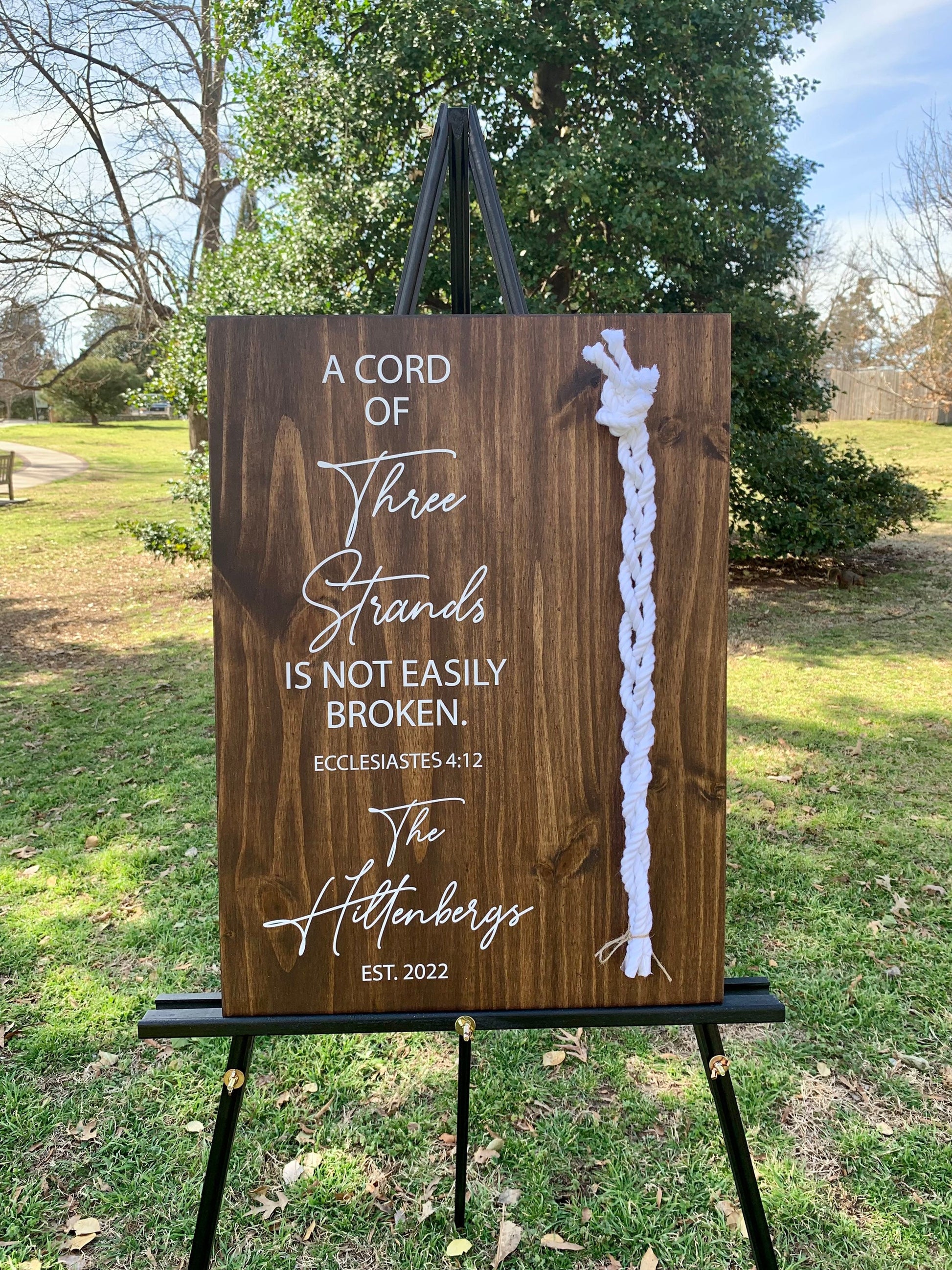 A wonderful wedding gift, anniversary gift, or perfect for display on a table at a wedding or reception! This sign features the verse "A cord of three strands is not easily broken" (Ecclesiastes 4: 12). It also includes a lovely rope detail (white cotton cords) appearing next to the verse. This sign comes in two sizes and is available in several stains options. Design is UV printed. Wall hardware is included.
