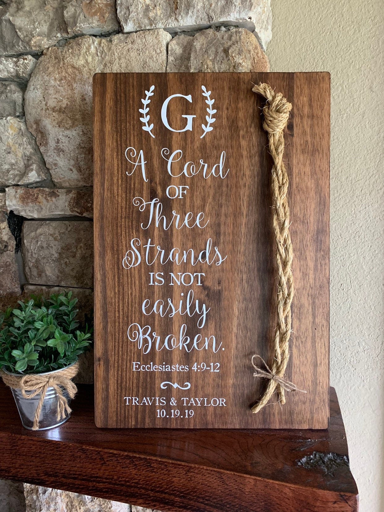 A wonderful wedding gift, anniversary gift, or perfect for display on a table at a wedding or reception! This sign features the verse "A cord of three strands is not easily broken" (Ecclesiastes 4: 12). It also includes a lovely rope detail appearing next to the verse. This sign comes in two sizes and is available in several stains options. Design is UV printed. Wall hardware is included.