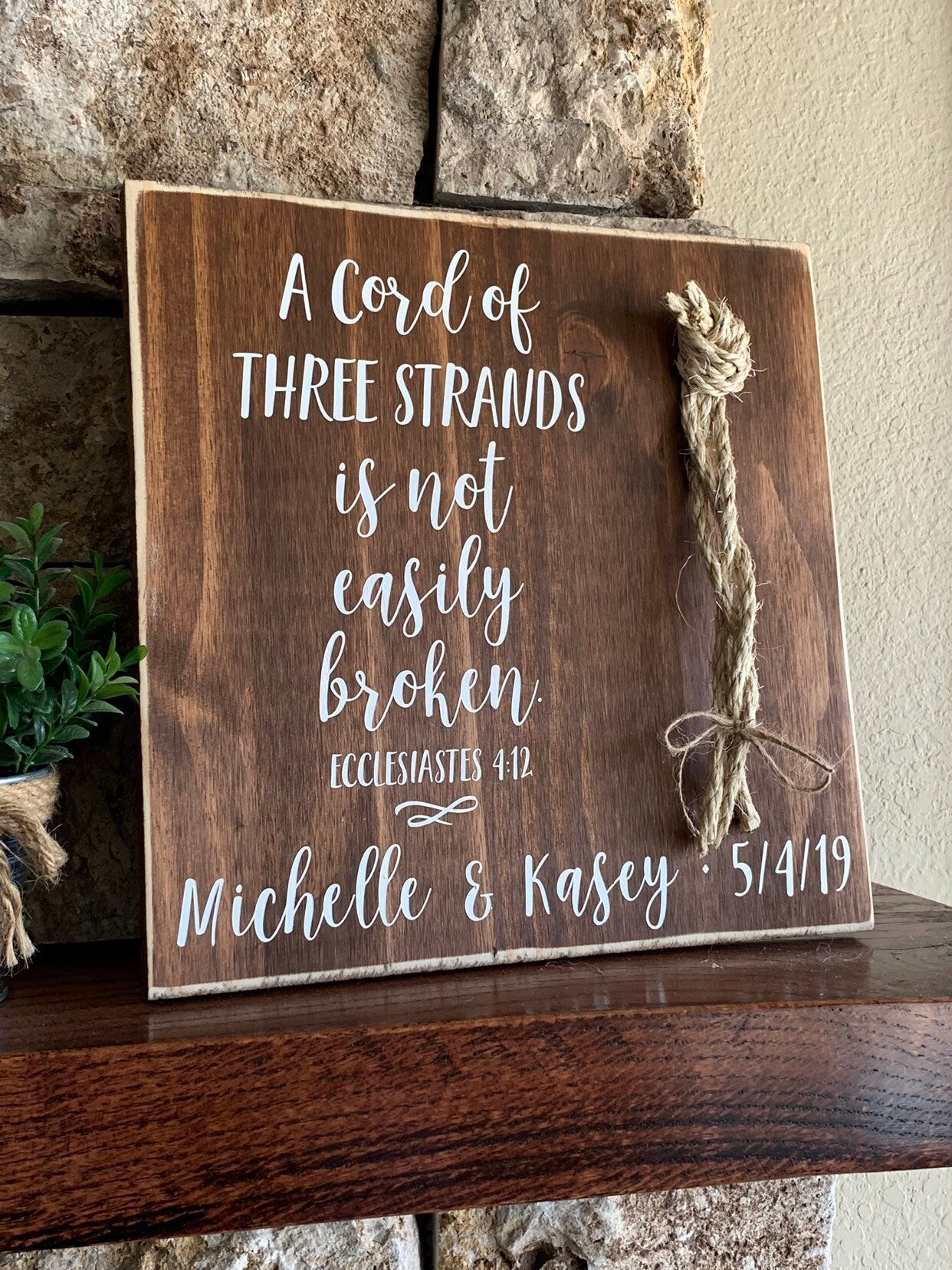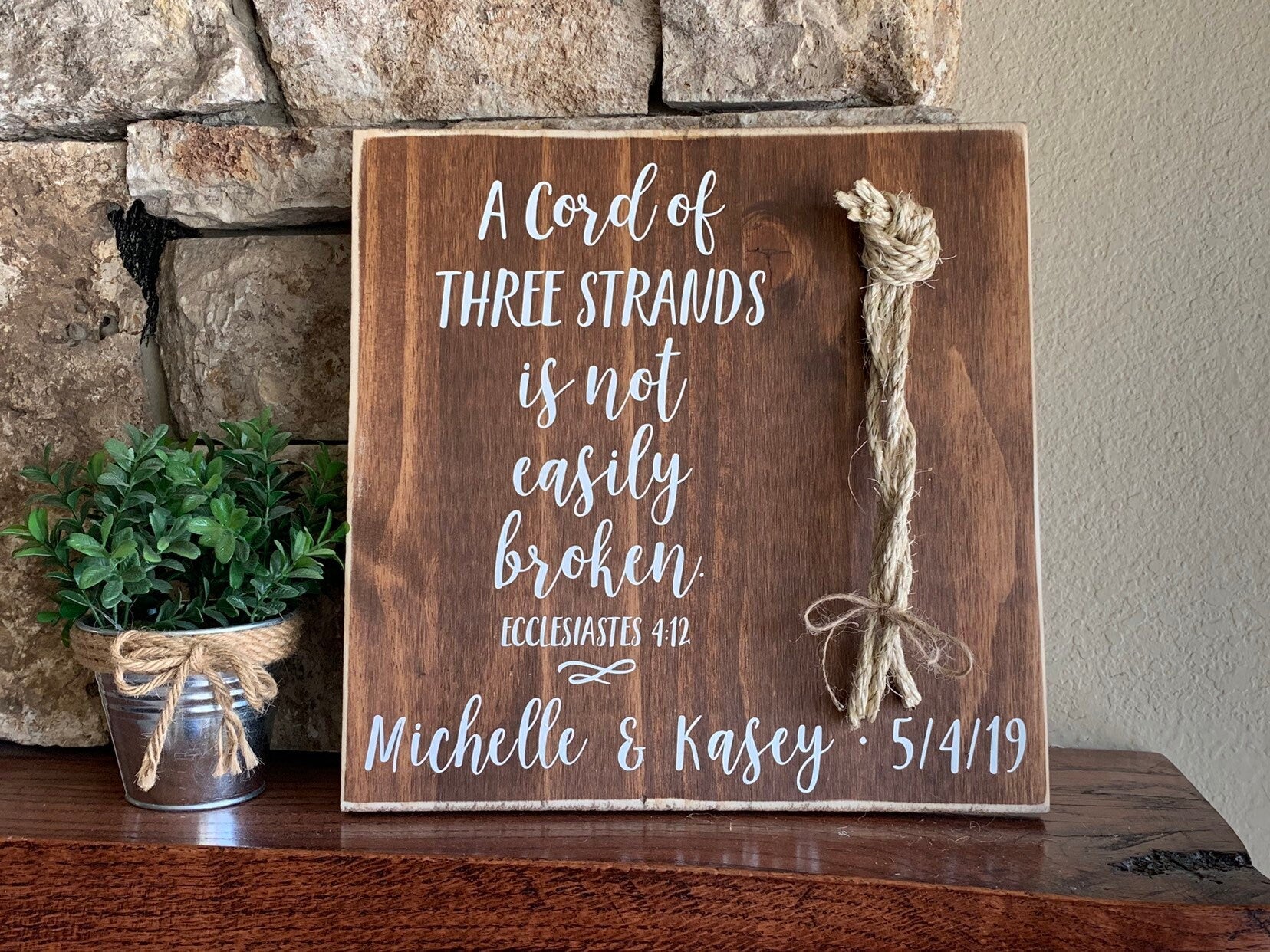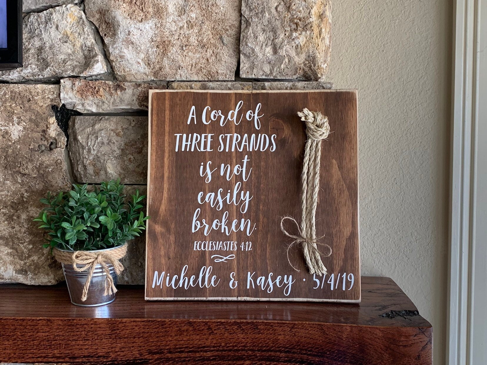 A wonderful wedding gift, anniversary gift, or perfect for display on a table at a wedding or reception! This sign features the verse "A cord of three strands is not easily broken" (Ecclesiastes 4: 12). It also includes a lovely rope detail appearing next to the verse. Many couples choose to braid the cords in the unity portion of their wedding ceremony.