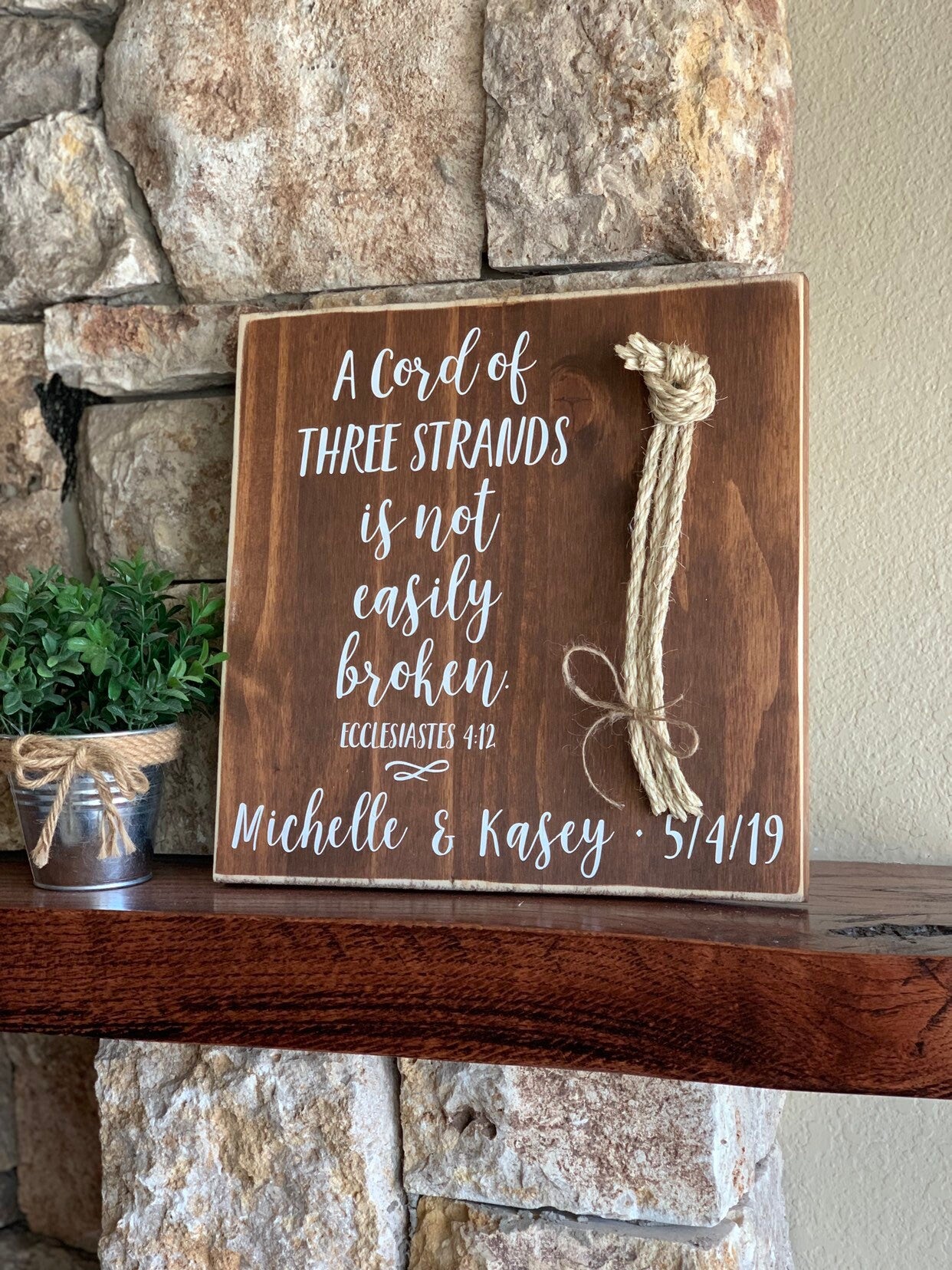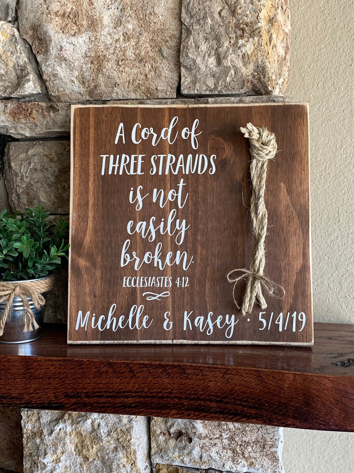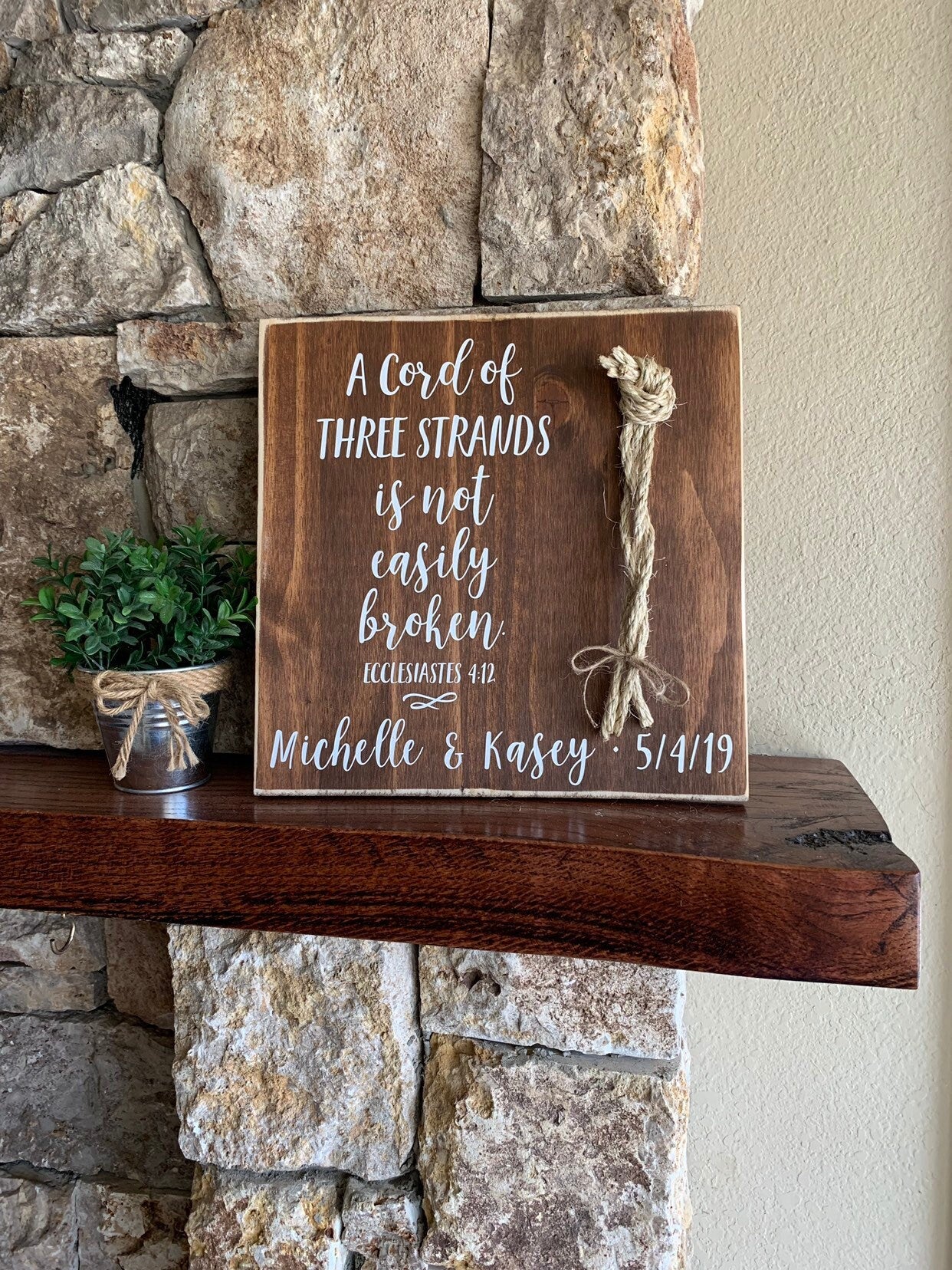A wonderful wedding gift, anniversary gift, or perfect for display on a table at a wedding or reception! This sign features the verse "A cord of three strands is not easily broken" (Ecclesiastes 4: 12). It also includes a lovely rope detail appearing next to the verse. Many couples choose to braid the cords in the unity portion of their wedding ceremony.