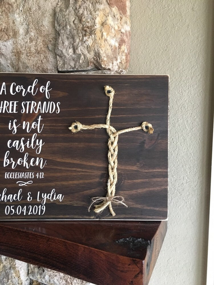 A wonderful wedding gift, anniversary gift, or perfect for display on a table at a wedding or reception! This sign features the verse "A cord of three strands is not easily broken" (Ecclesiastes 4: 9-12). It also includes a lovely rope detail appearing next to the verse. Many couples choose to braid the cords during the unity portion of their wedding ceremony.