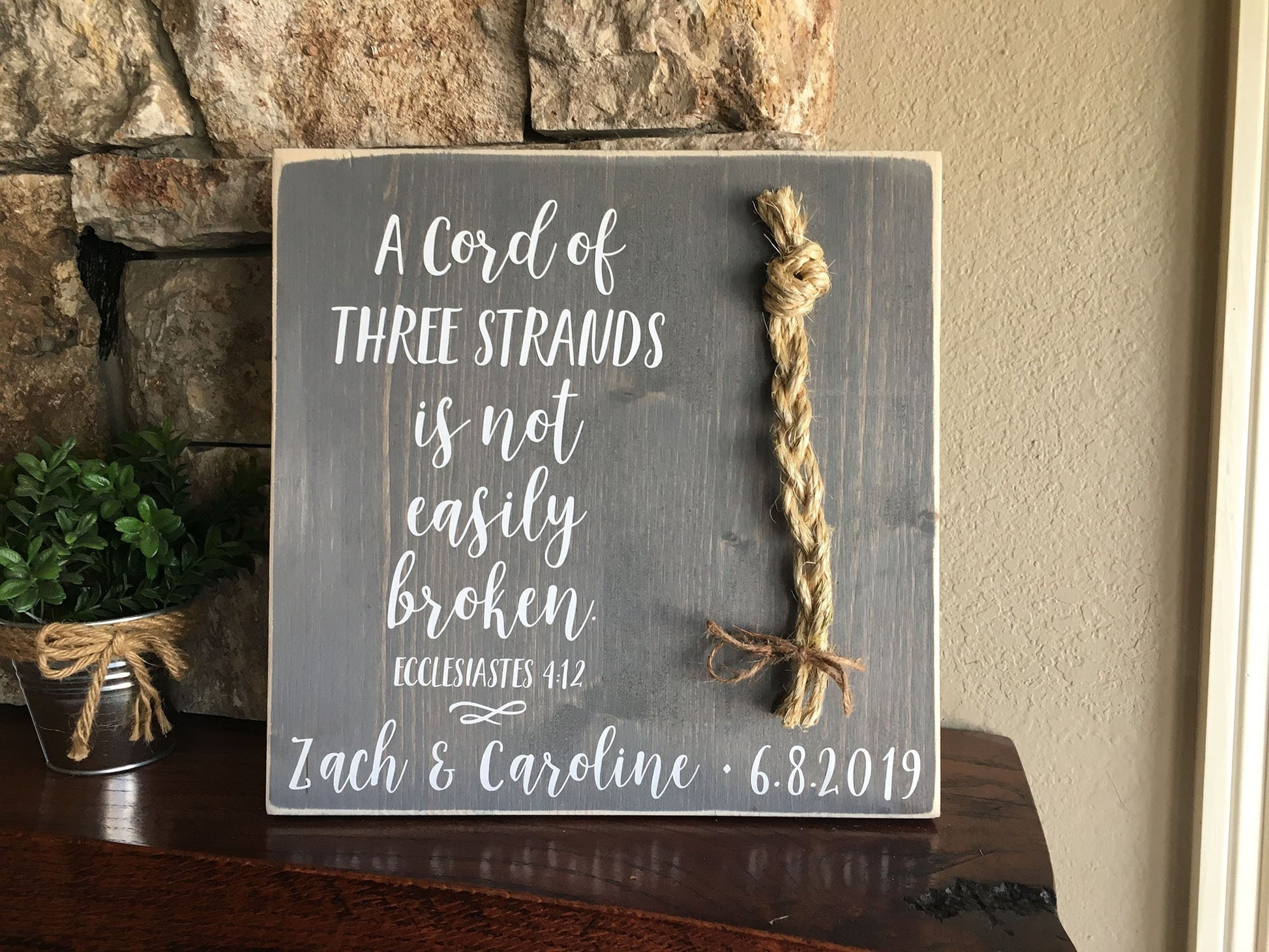 A wonderful wedding gift, anniversary gift, or perfect for display on a table at a wedding or reception! This sign features the verse "A cord of three strands is not easily broken" (Ecclesiastes 4: 12). It also includes a lovely rope detail appearing next to the verse. Many couples choose to braid the cords in the unity portion of their wedding ceremony.