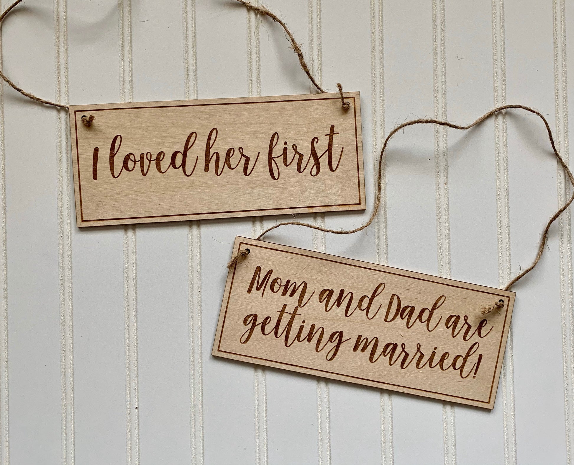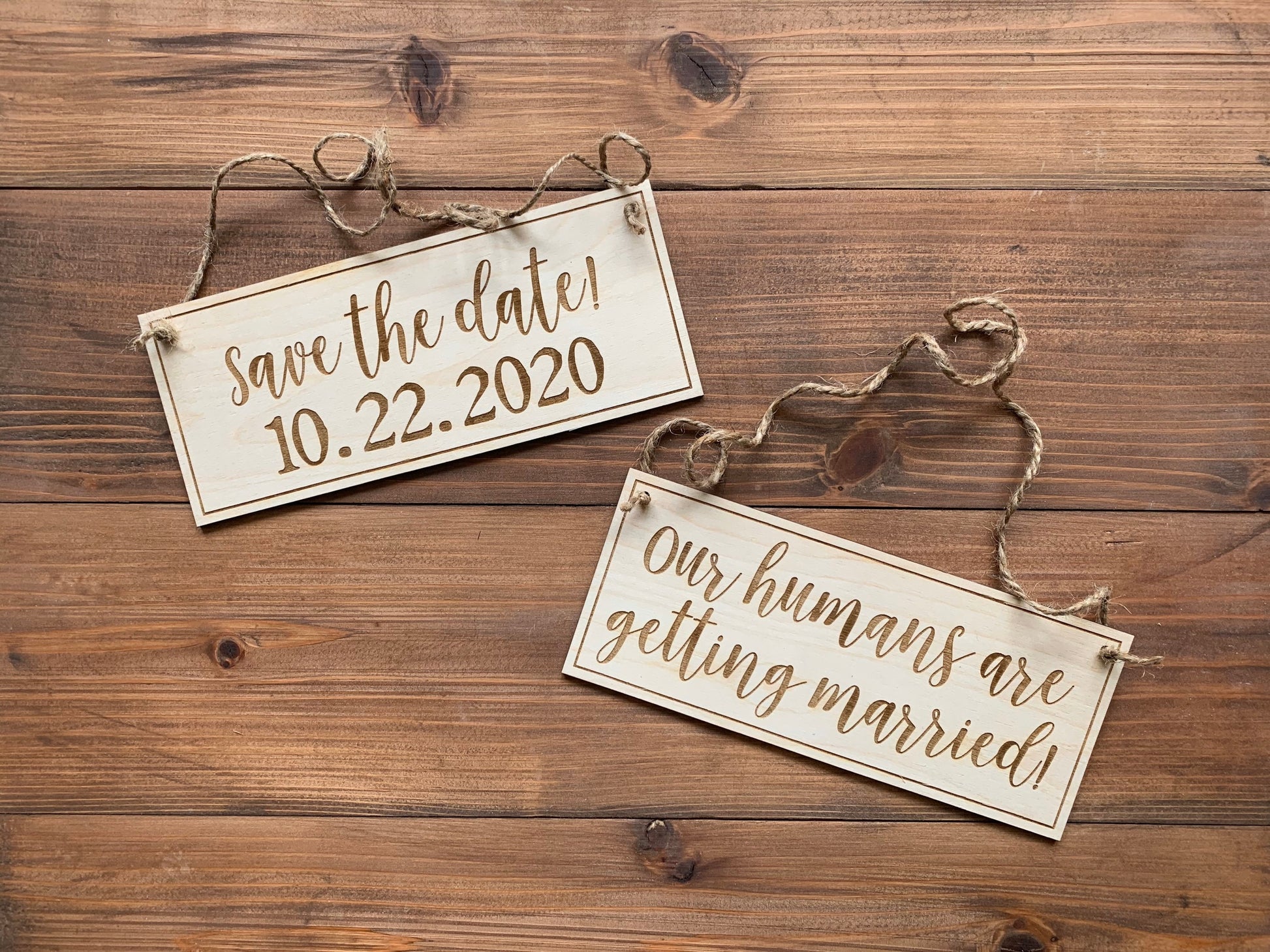 The perfect way to incorporate your fur babies into your save the date photos! These signs measure approximately 9" x 4" and come complete with twine attached. These signs are very light weight and will be comfortable for even very small pets. Please choose from a variety of phrases and sign combos. If you need a custom sign, message us and we will design it for you! Also if there is larger size you need please contact us for pricing.