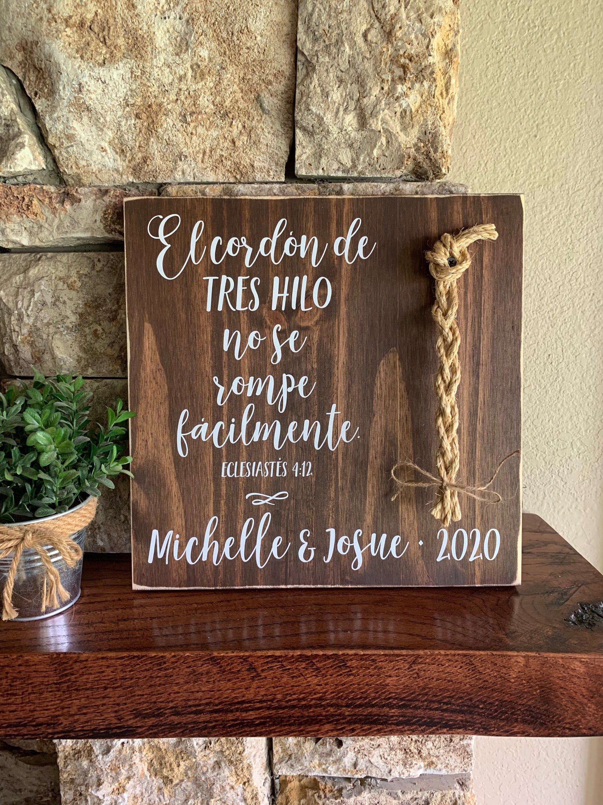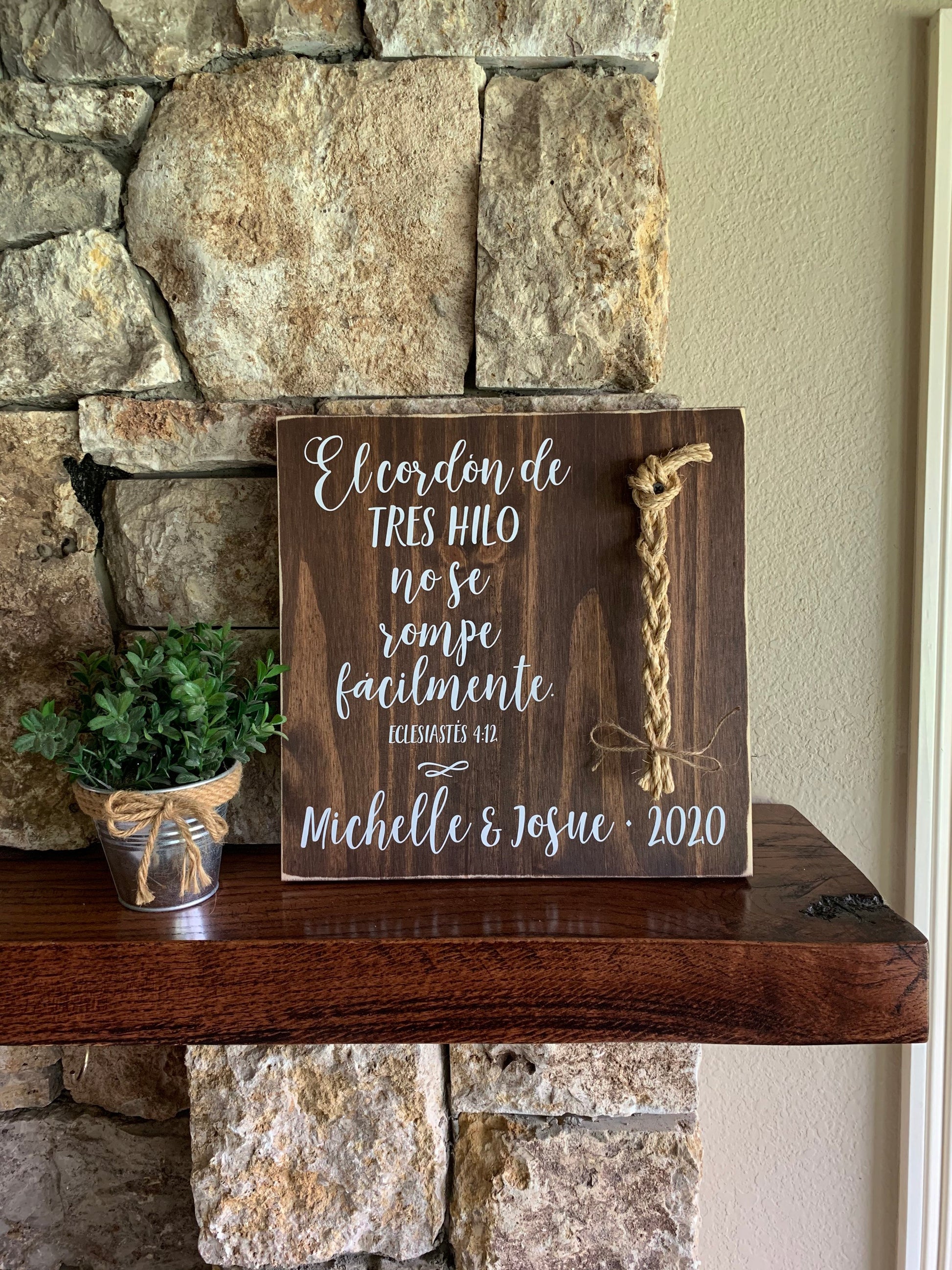 A wonderful wedding gift, anniversary gift, or perfect for display on a table at a wedding or reception! Many couples choose to braid the cords together in the unity portion of their wedding ceremony. This sign features the verse "El cordón de tres hilos no se rompe fácilmente." (ECLESIASTÉS 4:12). It also includes a lovely rope detail appearing next to the verse. Wall hardware is included. *Please note that the rustic white finish will come with black lettering*