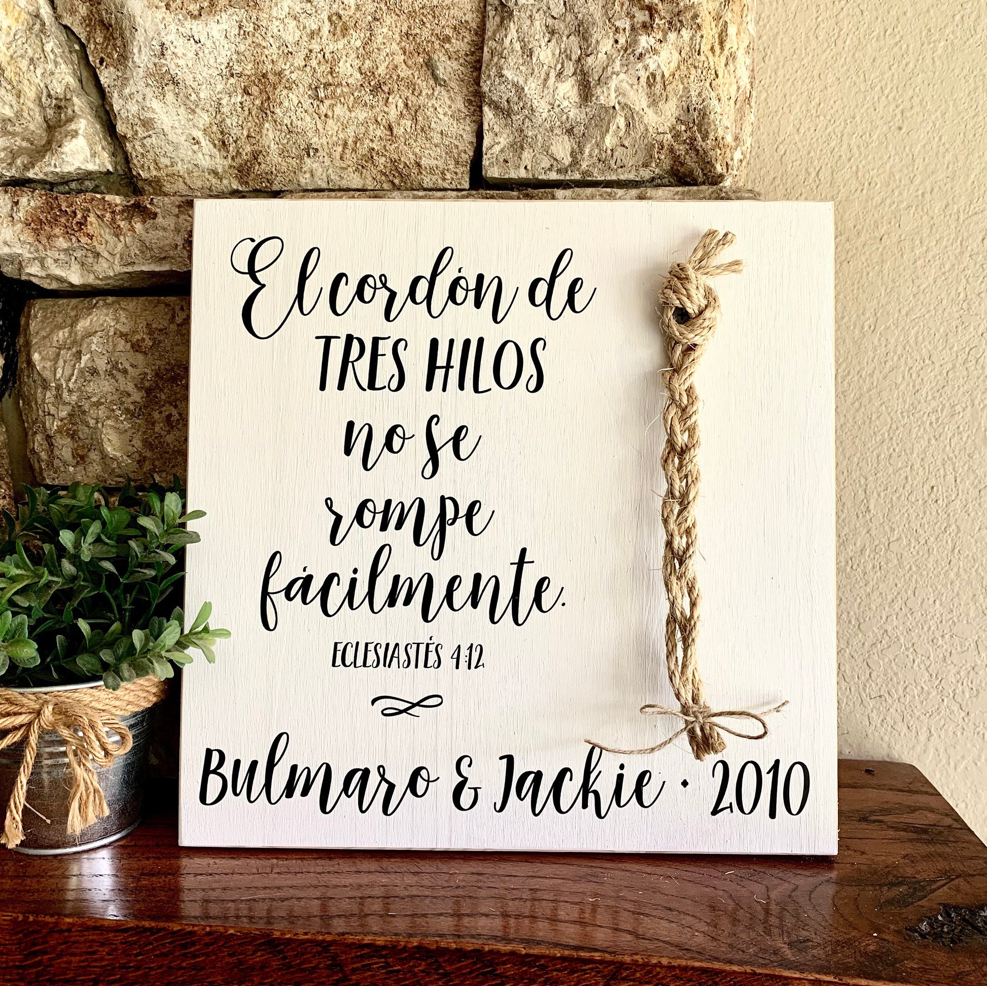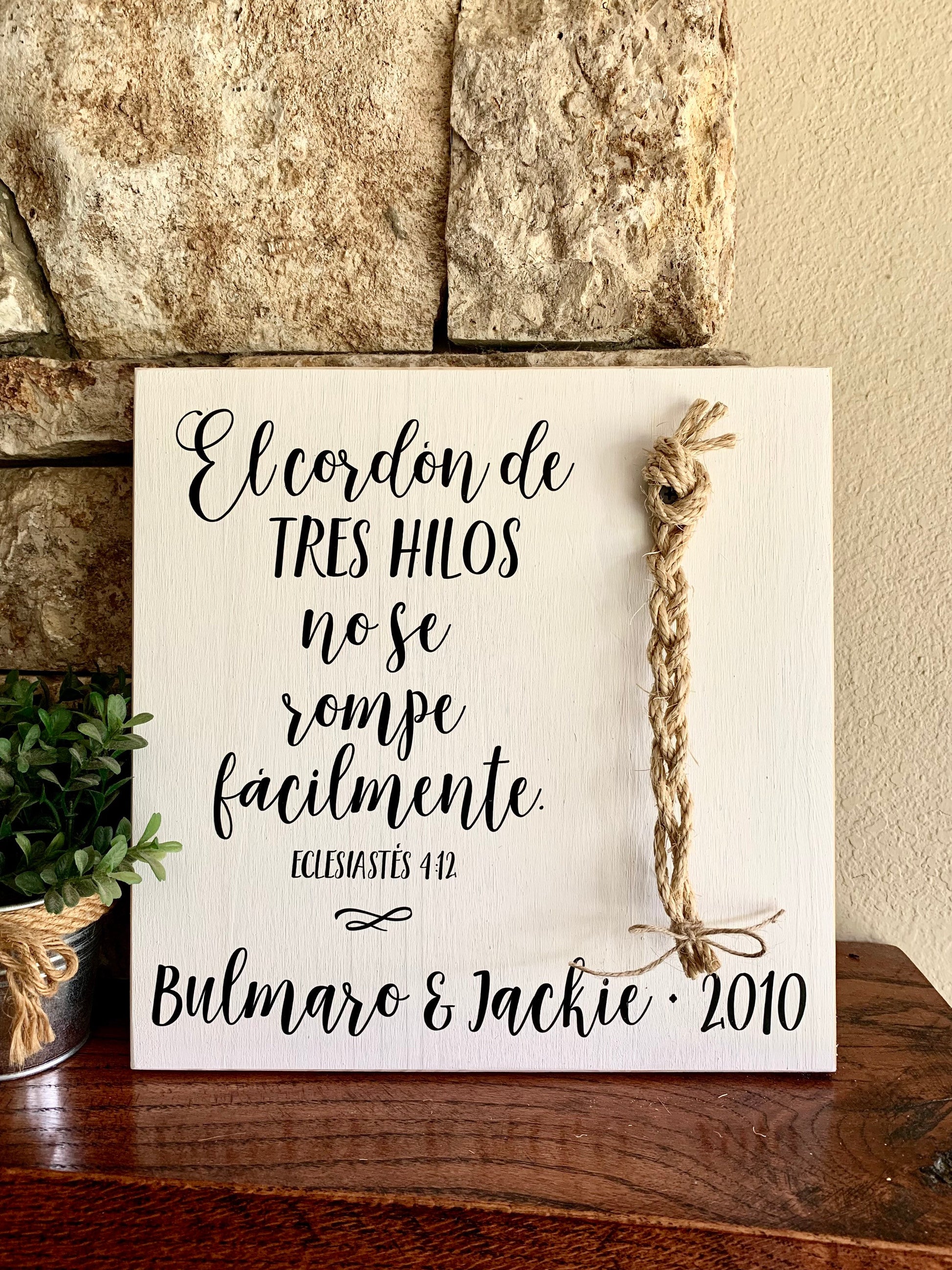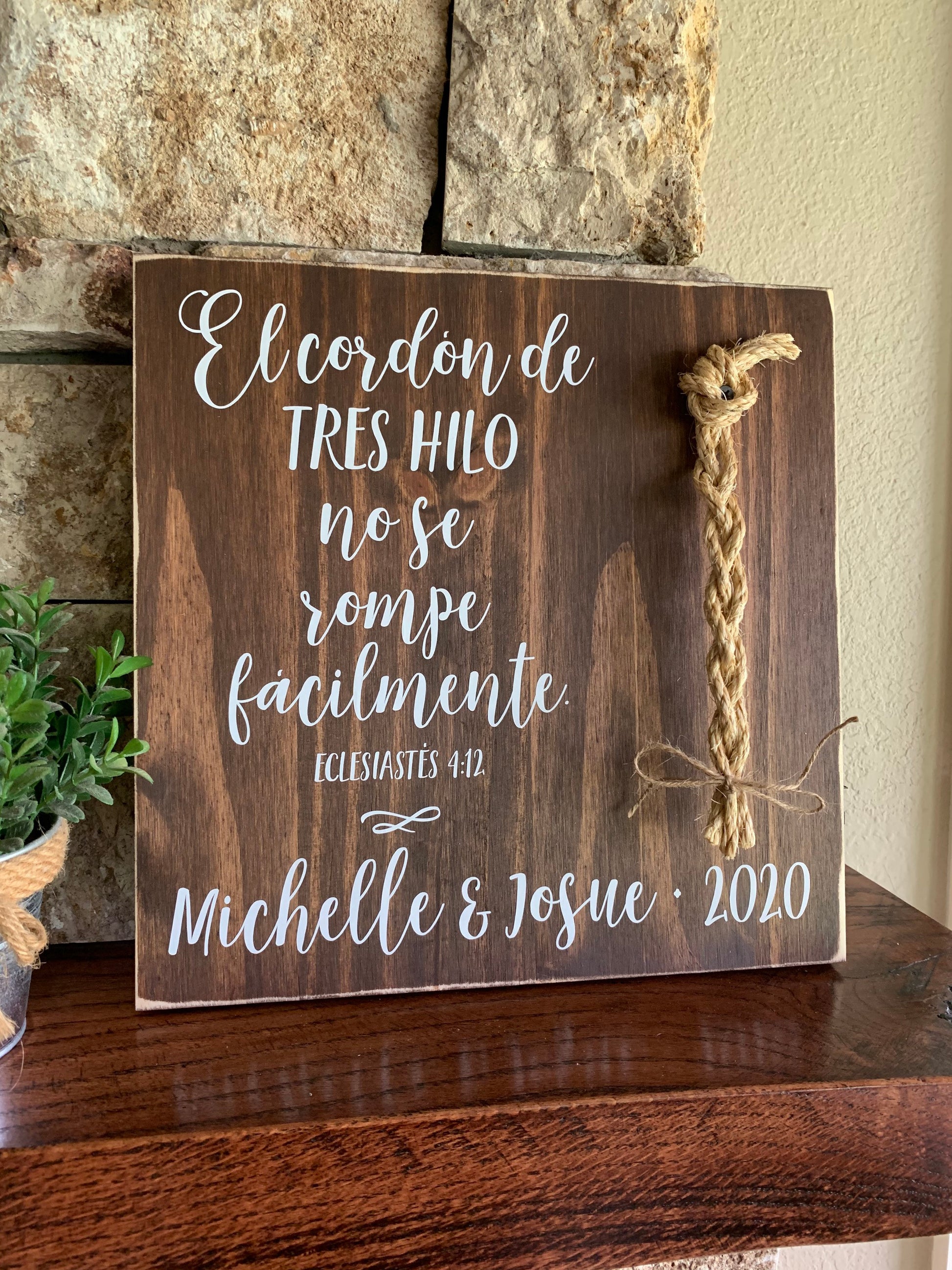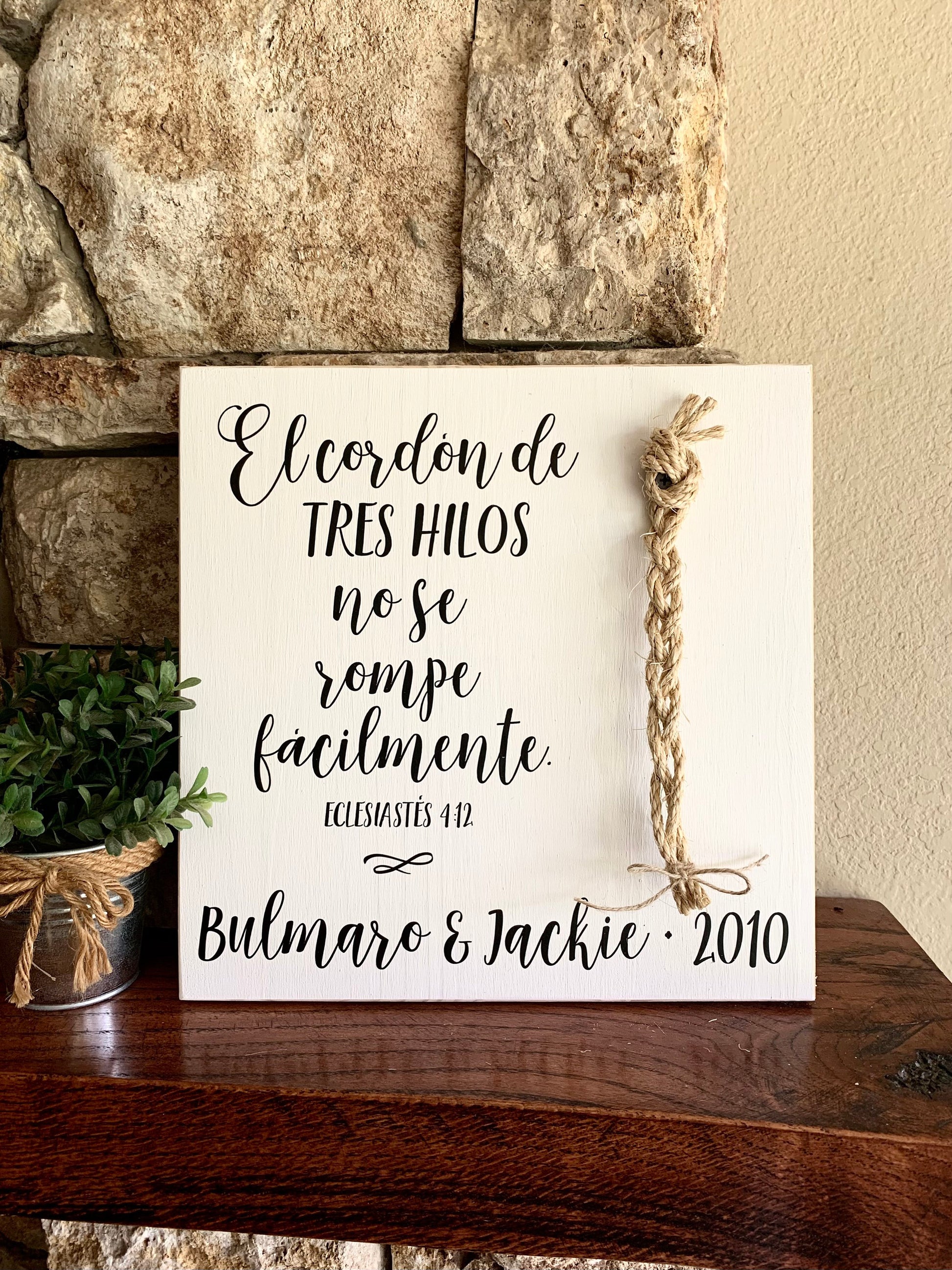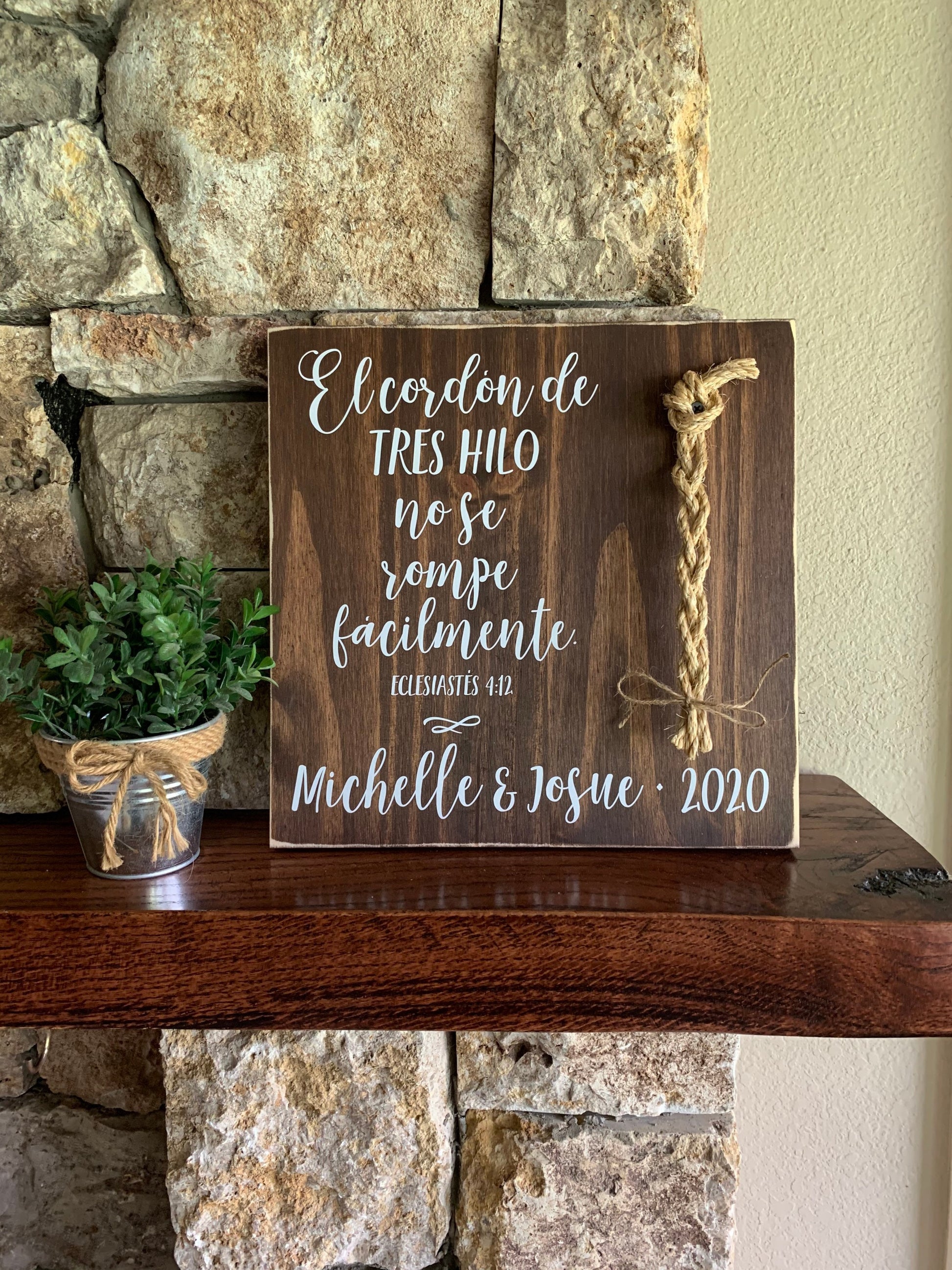 A wonderful wedding gift, anniversary gift, or perfect for display on a table at a wedding or reception! Many couples choose to braid the cords together in the unity portion of their wedding ceremony. This sign features the verse "El cordón de tres hilos no se rompe fácilmente." (ECLESIASTÉS 4:12). It also includes a lovely rope detail appearing next to the verse. Wall hardware is included. *Please note that the rustic white finish will come with black lettering*