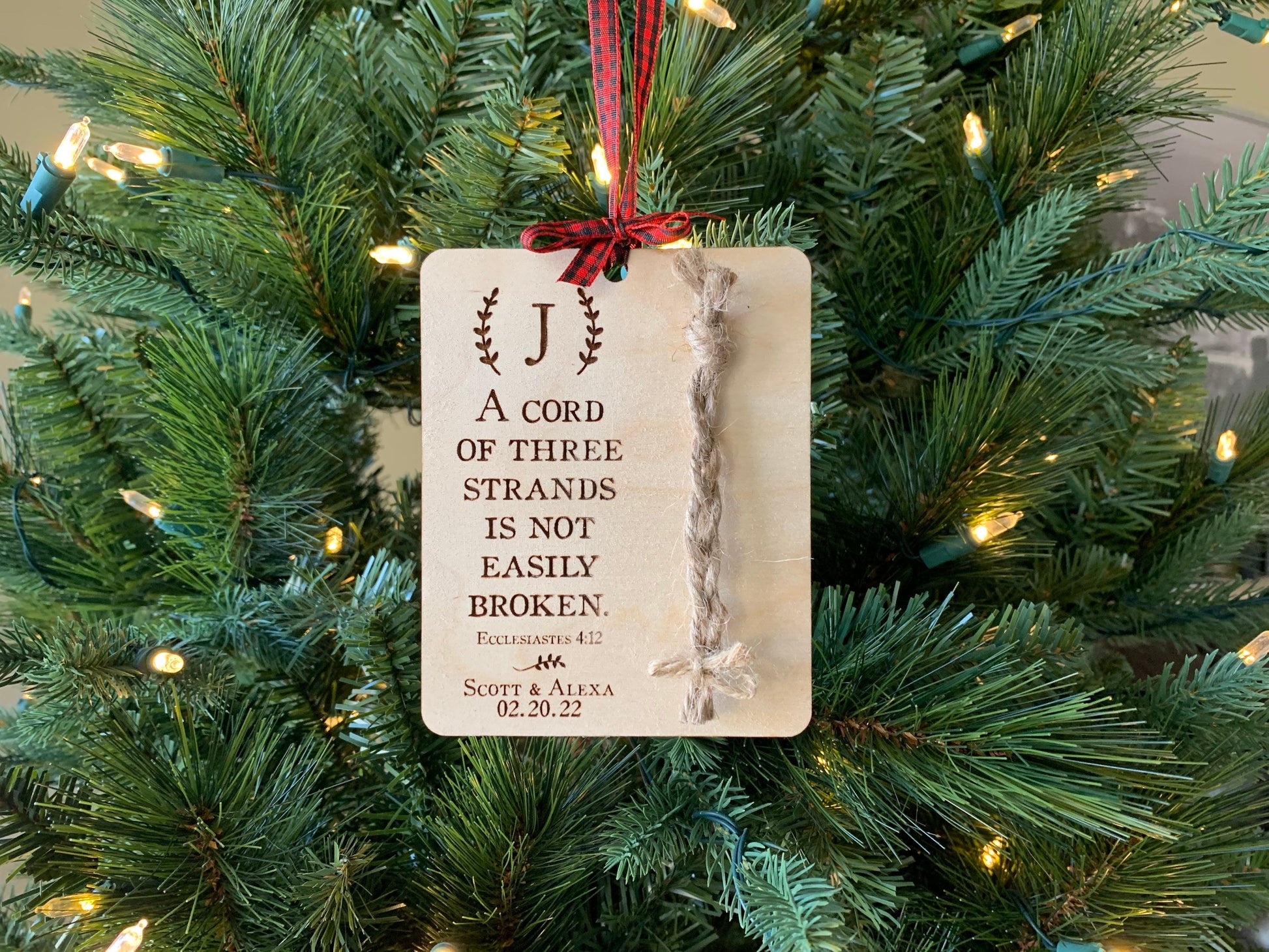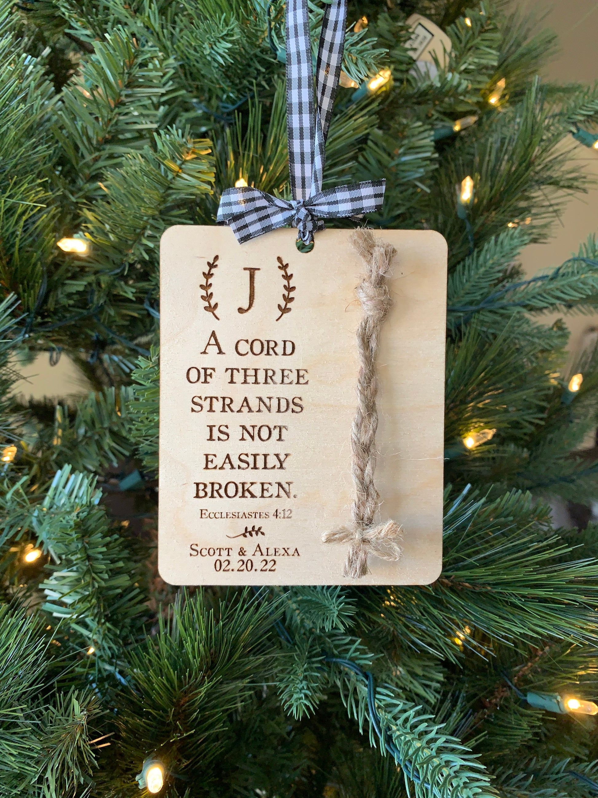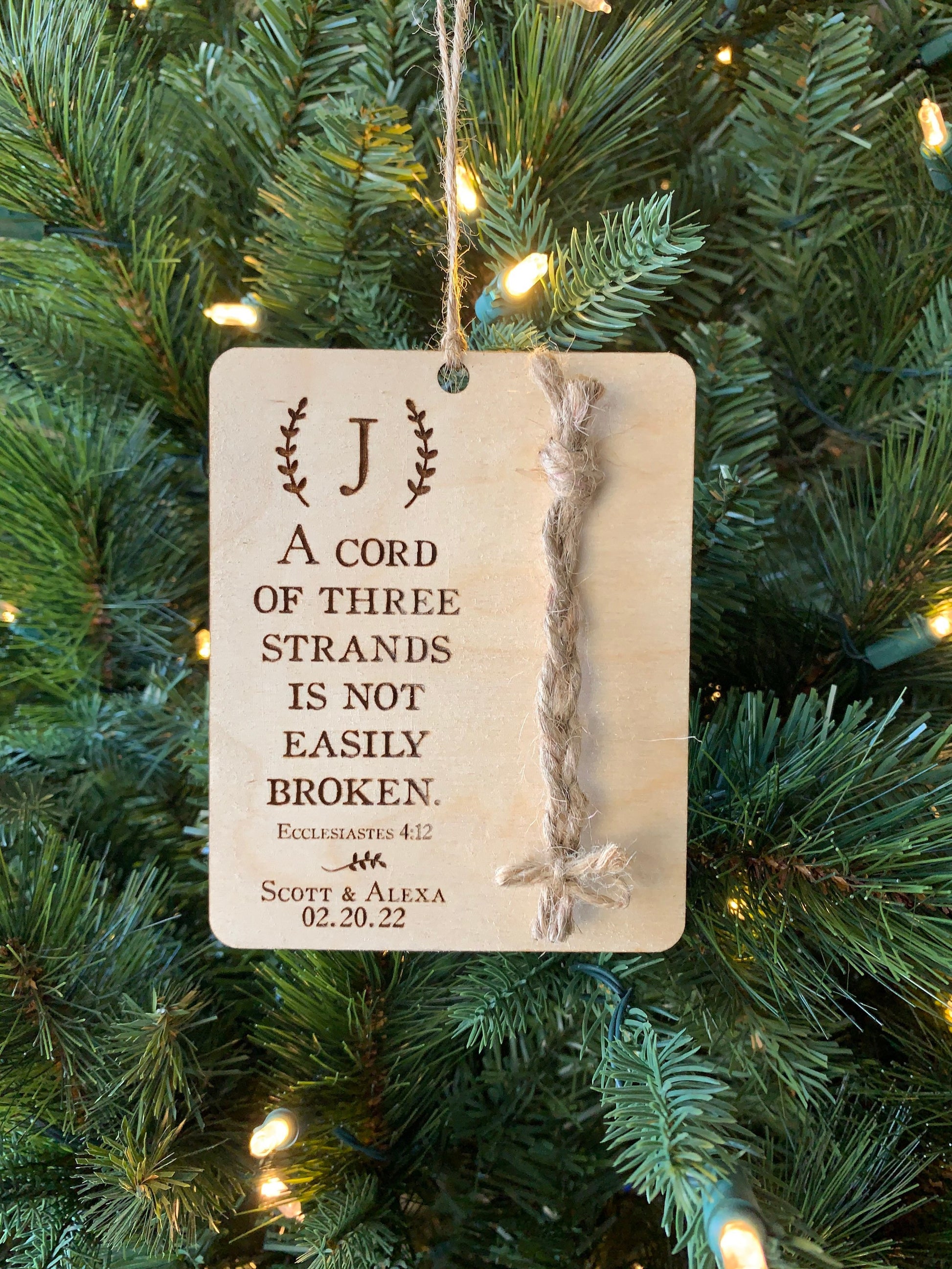 Our cute little cord of three strands ornament makes the perfect wedding gift, anniversary gift or first Christmas married gift. It feature 1/8" wood engraved with the verse "A cord of three strands is not easily broken. Ecclesiastes 4:12". It also feature a small braid of jute cords symbolizing the three strands. We personalize the ornament with the first names of the couple, the last name initial and the wedding date. This item includes a white gift box.