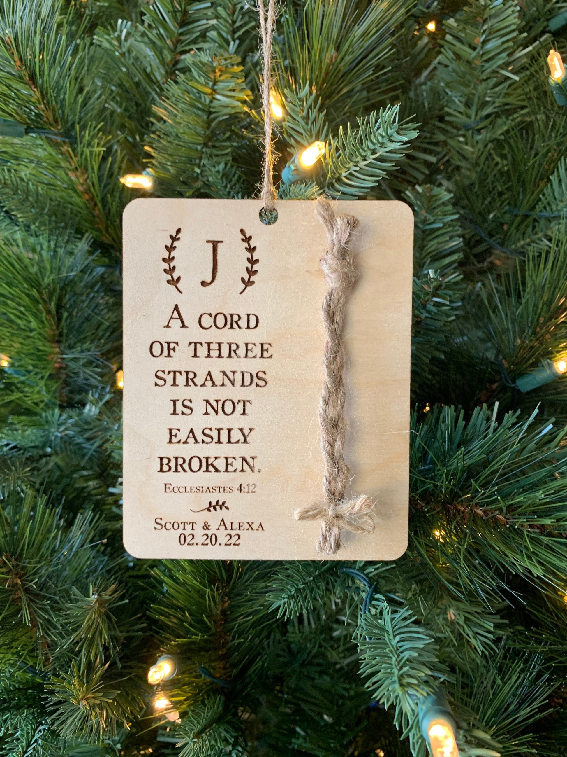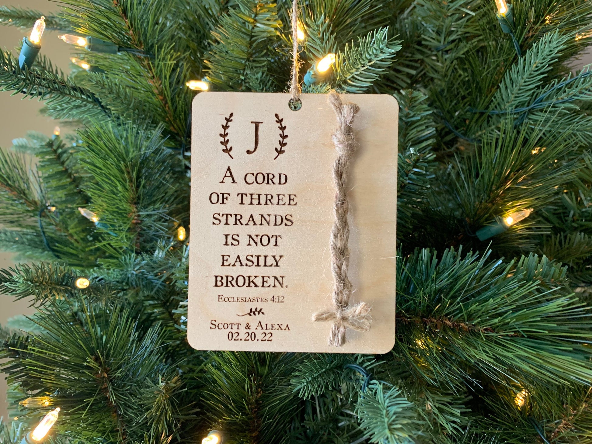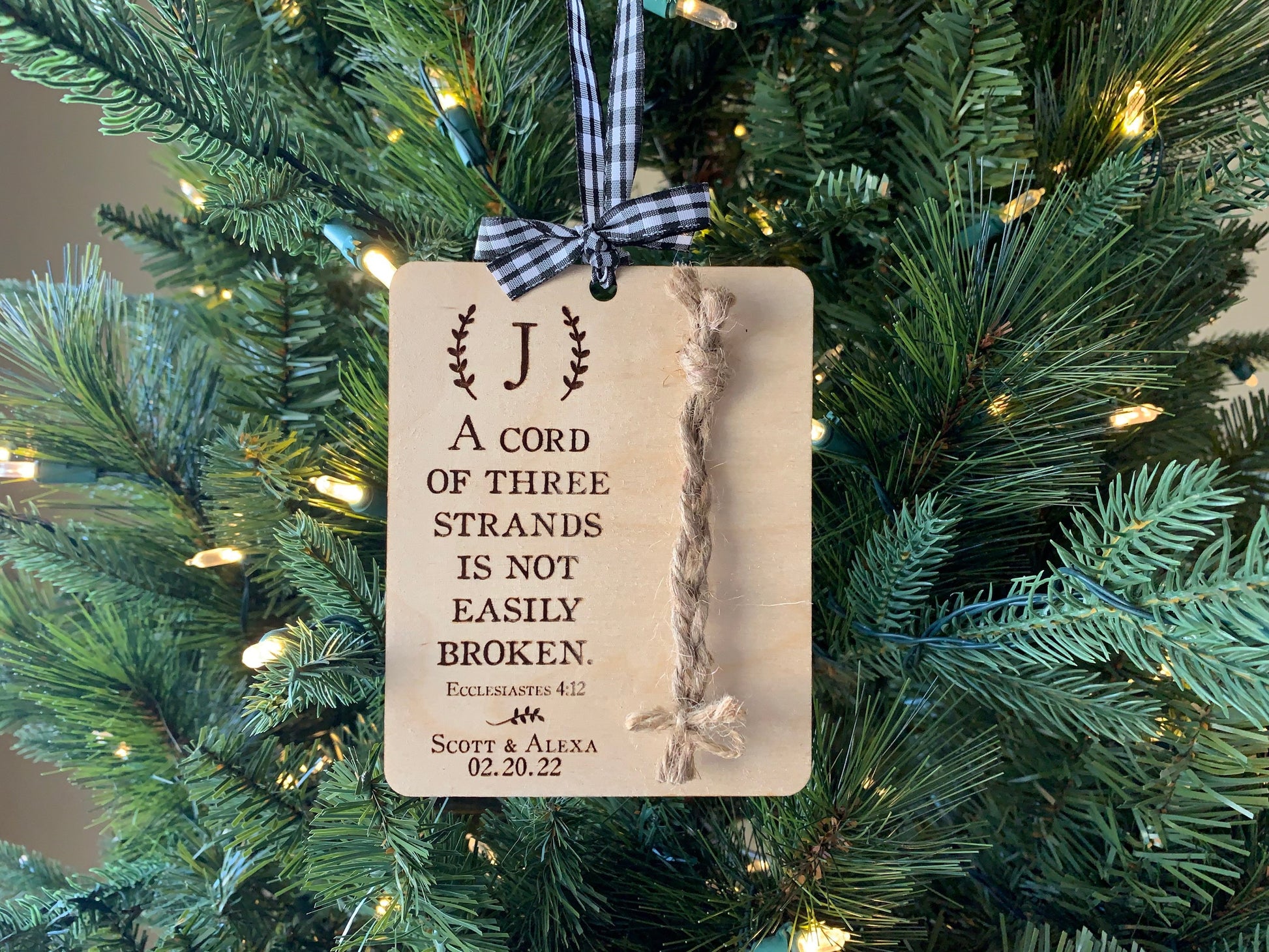 Our cute little cord of three strands ornament makes the perfect wedding gift, anniversary gift or first Christmas married gift. It feature 1/8" wood engraved with the verse "A cord of three strands is not easily broken. Ecclesiastes 4:12". It also feature a small braid of jute cords symbolizing the three strands. We personalize the ornament with the first names of the couple, the last name initial and the wedding date. This item includes a white gift box.